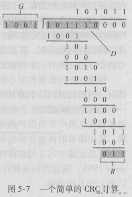 · · 所有的CRC计算都将采用模2算术进行,即加法不进位,减法不借位,相当于异或操作XOR,而乘除法还是和二进制算术中的一样,这样的话,给定D、R,D * 2r XOR R就可以产生d+r比特模式了。 · · 我们要求R对n有:D · 2r XOR R = nG,所以我们可以根据这个等式计算出D · 2r = nG XOR R,这个等式告诉我们R = D · 2r / G 的余数。如图:  · · CRC性能分析: