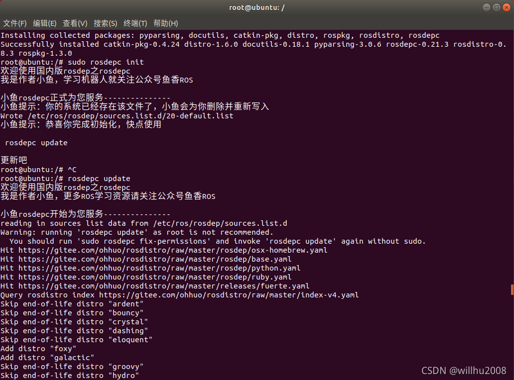 root@ubuntu:~# sudo rosdep update sudo: rosdep:找不到命令 root@ubuntu:~# rosdep init