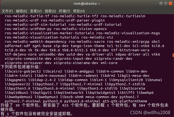 root@ubuntu:~# sudo apt update 命中:1 http://mirrors.aliyun.com/ubuntu bionic InRelease 命中:2 http://mirrors.aliyun.com/ubuntu bionic-updates InRelease ? ? ? ? ? ? ?? 命中:3 http://mirrors.aliyun.com/ubuntu bionic-backports InRelease ? ? ? ? ? ?? 命中:4 http://mirrors.aliyun.com/ubuntu bionic-security InRelease ? ? ? ? ? ? ? 命中:5 http://archive.ubuntukylin.com:10006/ubuntukylin xenial InRelease ? ? ?? 获取:6 http://packages.ros.org/ros/ubuntu bionic InRelease [4,680 B] ? ? ? ? ?? 获取:7 http://packages.ros.org/ros/ubuntu bionic/main amd64 Packages [776 kB] 获取:8 http://packages.ros.org/ros/ubuntu bionic/main i386 Packages [26.4 kB] 已下载 807 kB,耗时 4秒 (187 kB/s) ? 正在读取软件包列表... 完成 正在分析软件包的依赖关系树 ? ? ?? 正在读取状态信息... 完成 ? ? ?? 有 543 个软件包可以升级。请执行 ‘apt list --upgradable’ 来查看它们。 执行效果如图: