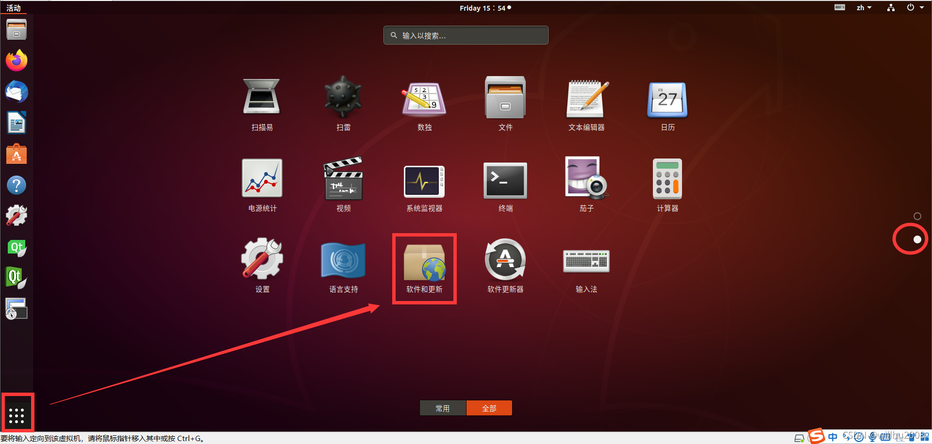 打开Ubuntu18.04,在桌面点击更多软件图标,翻页可看到软件和更新图标,点击打开。