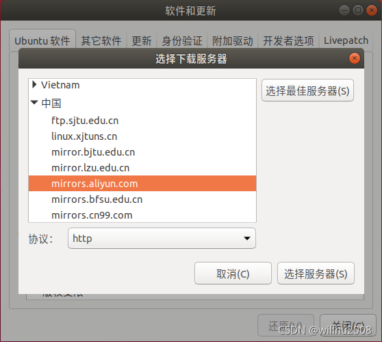 在打开新窗口界面中,选择"Ubuntu软件|下载自"下拉框,选择阿里云。