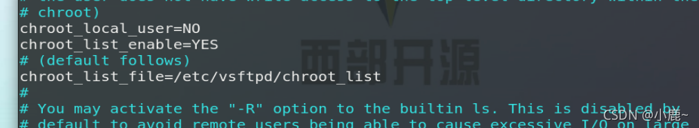 7、锁定用户到自己的家目录中的白名单 hroot_local_user=YESchrooct_list_enable=YESchroot_list_file=/etc/vsftpd/chroot_list