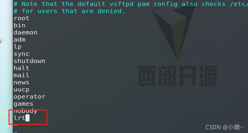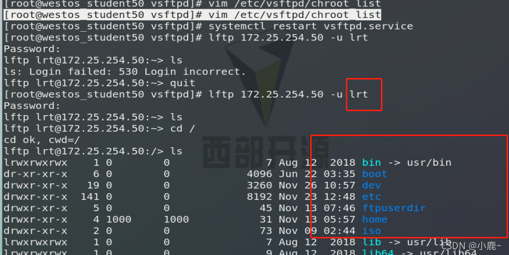 编写vsftp服务的配置文件,设定chroot_local_user=YES,重启服务,编写锁定名单(/etc/vsftpd/chroot_list默认不存在),在名单中添加用户lrt,只有名单中的lrt用户访问lftp后可以切换浏览根/,不在名单中的westos用户访问lftp后被锁定到自己的家目录中