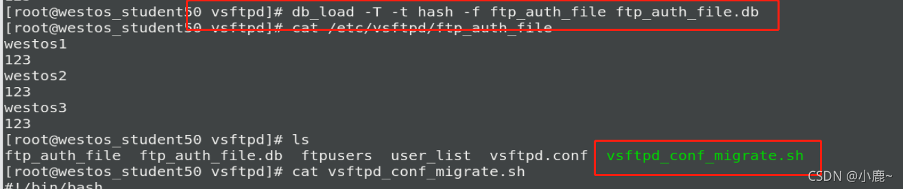[root@westos_student50 vsftpd]# db_load -T -t hash -f ftp_auth_file ftp_auth_file.db #####加密认证文件 -T 转换 -t type -f 指定