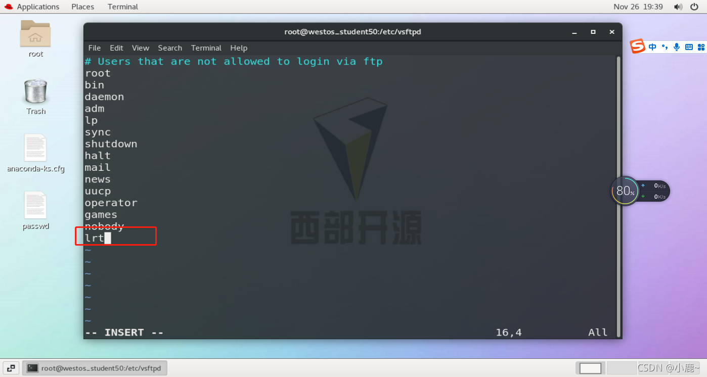 [root@westos_student50 vsftpd]# vim /etc/vsftpd/chroot_list