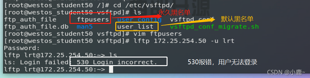/etc/vsftpd/ftpusers: 永久用户登录黑名单,在该名单中的用户无法访问ftp /etc/vsftpd/user_list: 用户列表,默认为用户登录黑名单,在该名单中的用户无法访问ftp;可以在配置文件中设定userlist_deny=NO,此时该用户列表为用户登录白名单,不在名单中的用户不能访问ftp