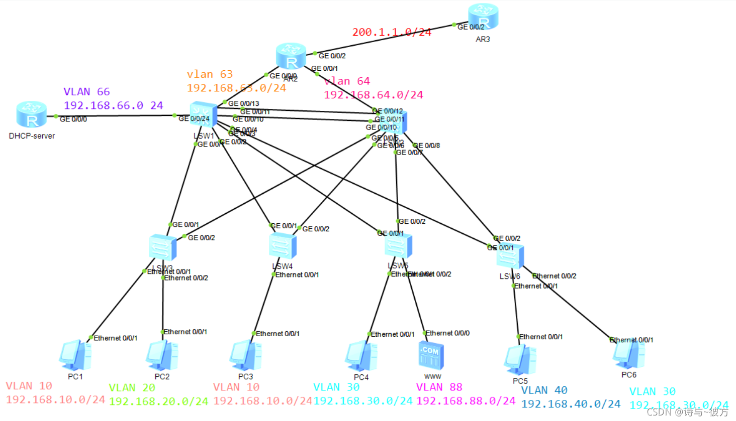 配置思路: 第一步:配置接入层 ??? 1、创建vlan ??? 2、设置接口模式 ??? 3、加入vlan ??? 4、开启bpdu ??? 5、查看配置结果 第二步:配置核心交换机 第三步:配置出接口 第四步:配置静态路由实现互通 ??? 1、分别在交换机1、2上配置一条缺省路由指向出口 ??? 2、在出口路由器上配置一条缺省路由指向internet ??? 3、在出口路由器上配置主、备份路由,指向sw1、sw2 第五步:配置vrrp主、备份虚拟网关冗余 ??? 1、正常情况下用户流量都是从sw1上进行处理, ??? 只有当sw1出故障后、VR肉片备份自动切换到sw2上处理 第六步:为了避免sw1、sw2之间vrrp主备份状态, ??? 需要关闭接入交换机连接上行链路接口的stp功能 第七步:配置出路由器实现上网 ??? 1、配置acl,允许上网 ??? 2、在连接internet的接口配置nat地址装换 ??? --nat outbound 2000 ??? 3、配置dns地址解析功能 ??? --dns resolve ??? --dns server 8.8.8.8 ??? --dns proxy enable 第八步:配置dhcp ??? 1、配置dhcp-server服务器 ??? 2、配置用户从全局地址池获取IP地址 ??? --dhcp select global ??? 3、通过关闭接口的stp或者把连接终端的交换 机设置为边缘端口-可解决获取地址时间较长的问题 ??? --stp enable ??? --stp edged-port enable ??? 4、查看全局地址池的使用情况 ??? --display ip pool ? 配置dhcp snooping和ipsg ??? 1、在接入交换机开启dhcp snooping功能 ??? --dhcp enable ??? --dhcp snooping enable ??? 2、在连接终端的接口上使用dhcp snooping功能 ??? --dhcp snooping enable ??? 3、在连接dhcp服务器上使用dhcp snooping功能,并将接口设置为授信任接口 ??? --dhcp snooping enable ??? --dhcp snooping trusted ??? 4、为了防止网络内部用户私自更改IP地址攻击网络,在接入交换机开启DHCP Snooping功能后,还需要开启IP报文检查功能,这样从VLAN收到报文后会将报文与动态绑定表的表项进行匹配,放行匹配的报文,丢弃不匹配的报文。如果不想对整个VLAN收到的报文进行检查,可以只在连接某个终端的接口上开启IP报文检查功能 第九步:用ospf路由协议代替静态路由?? ? ??? 1、删除核心交换机的静态路由配置 ??? 2、删除出接口到内网的静态路由,保留到Internet的缺省路由 ??? 3、配置ospf ??? 4、出口路由器的ospf配置,为了连接内网和Internet需要指向internet的静态缺省路由,需要ospf进程引入缺省路由,同时需要配置一条缺省路指向internet 第十步:配置可靠性和负载分担 ??? 1、配置VRRP联动接口检测链路:主备设备的上行接口出现故障的时通过配置VRRP与接口状态联动功能可以实现此快速切换 ??? 2、配置负载分担:把VRRP主备备份配置为负载分担,一些VLAN以CORE1为主设备,另一些VLAN以CORE2为主设备,不同VLAN的流量被分配到了左右两条链路上,有效的利用现网资源 第十一步:配置链路聚合 ??? 1、恢复接口默认配置 ??? 2、配置链路聚合:手工负载分担(默认)和lcp模式 ??? --lacp priority 100 //配置系统优先级为100,使其成为LACP主动端 第十二步:配置限速 ??? 1、基于IP地址对A限速,只能在r1路由器上配置每IP限速 ??? --qos car inbound source-ip-address range x.x.x.x to x.x.x.x per-address cir 1024 ??? 2、基于网段总流量对B限速 ??? --acl 2000 ??? --rule permit source 10.1.20.0 0.0.0.255 ??? --qos car inbound acl 2000 cir 2048 //访问网络速度为2M ??? --qos car outbound acl 2000 cir 4096 //下载速度为4M 第十三步:配置映射内网服务器和公网多出口 ??? 1、配置内部服务器,使用公网用户通过公网地址访问内网服务器 ??? --nat server protocol tcp global current-interface www inside 192.168.88.251 www ??? --nat server protocol tcp global current-interface ftp inside 192.168.88.252 ftp ??? 2、由于ftp是一个多通道协议,需要在出口路由器使用alg功能 ??? --nat alg ftp enable ??? 3、配置内网用户使用公网地址访问内网服务器 ??? 4、在内网接口做nat转换 ??? 5、分别在内网接口下面做内部服务器映射 第十四步:验证 ??? 1、从两个部门内各选一台PC进行ping测试,如果测试正常则说明三层互通正常 ??? 2、部门内部选两台PC进行ping测试,如果测试正常则说明部门内二层互通正常