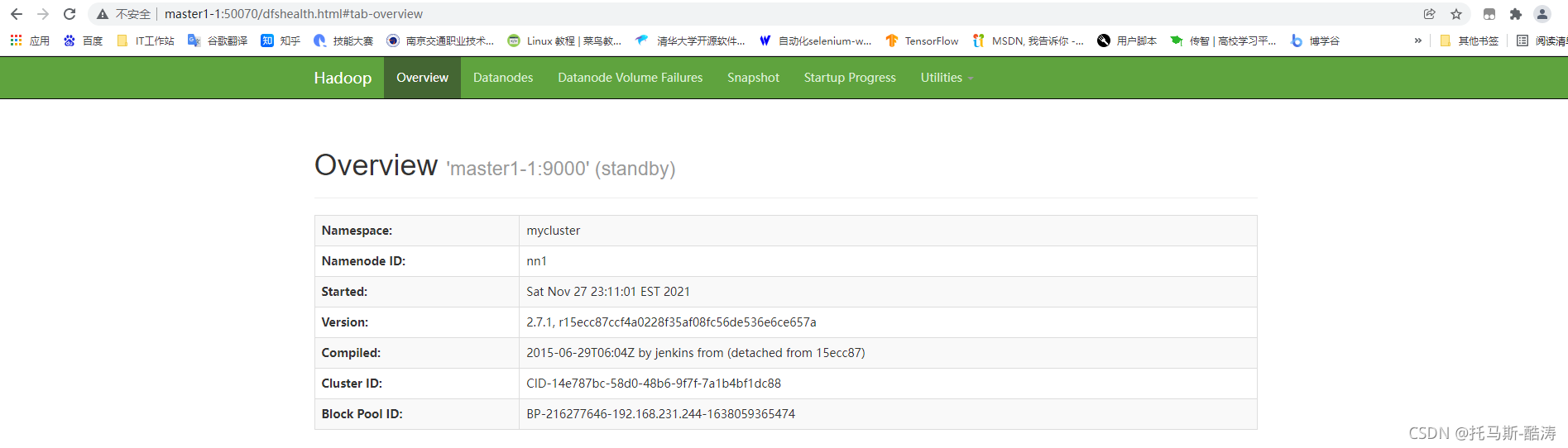 地址栏输入master1-1:50070 如图所示