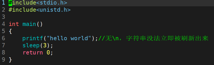 ?行缓冲遇到上述五种情形会刷新缓冲区,全缓冲遇到除最后一种情形会刷新缓冲区 ?一份代码验证缓冲区:  理论上应该是先打印“hello world”再sleep,但观察到的现象是先sleep再打印。这是因为字符串被保留在缓冲区,不满足上述五种刷新条件所以没有被立即刷新出来,当进程结束后“hello world”才出现