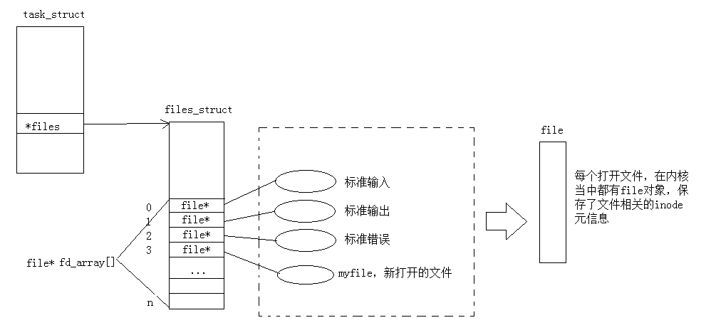 当我们打开文件时,该文件的相关信息会被加载到内存,如创建时间,所属者,操作权限等等,OS对这些信息则需用数据结构维护起来,从而有了struct file(用于描述内存中的文件),多个打开的文件就有多个struct,它们管理起来形成双向链表,结构体里存放文件的属性信息。每个进程进程都拥有task_struct进程控制块,task_struct里面有个指针files,用于指向一张表files_struct,该表包含了一个指针数组,而这数组里每个指针指向一个内存中的文件struct file,从而实现了进程与文件的连接,而文件描述符就是该数组的下标,只要知道文件描述符就可以找到内存中的文件  FILE结构体部分成员:  新视角阐释fopen做了什么 1.给调用的用户申请FILE结构体并返回地址(FILE) 2.底层调用系统级函数open得到fd,将fd填充到FILE变量中的fileno