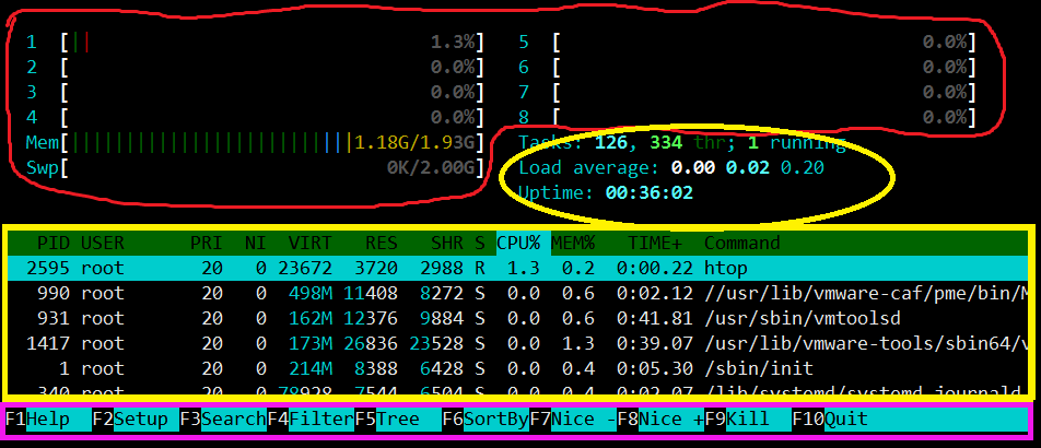 top 在linux系统中,top 命令用来显示系统中正在运行的进程的实时状态,它显示了一些非常有用的信息,比如 CPU 利用情况、内存消耗情况,以及每个进程情况等。 htop 与 Linux传统的 top 相比,htop 更加人性化。它可让用户交互式操作,支持颜色主题,可横向或纵向滚动浏览进程列表,并支持鼠标操作。 htop可以分为四个区域。具体如下划分:  可以看到总共分四个区域: