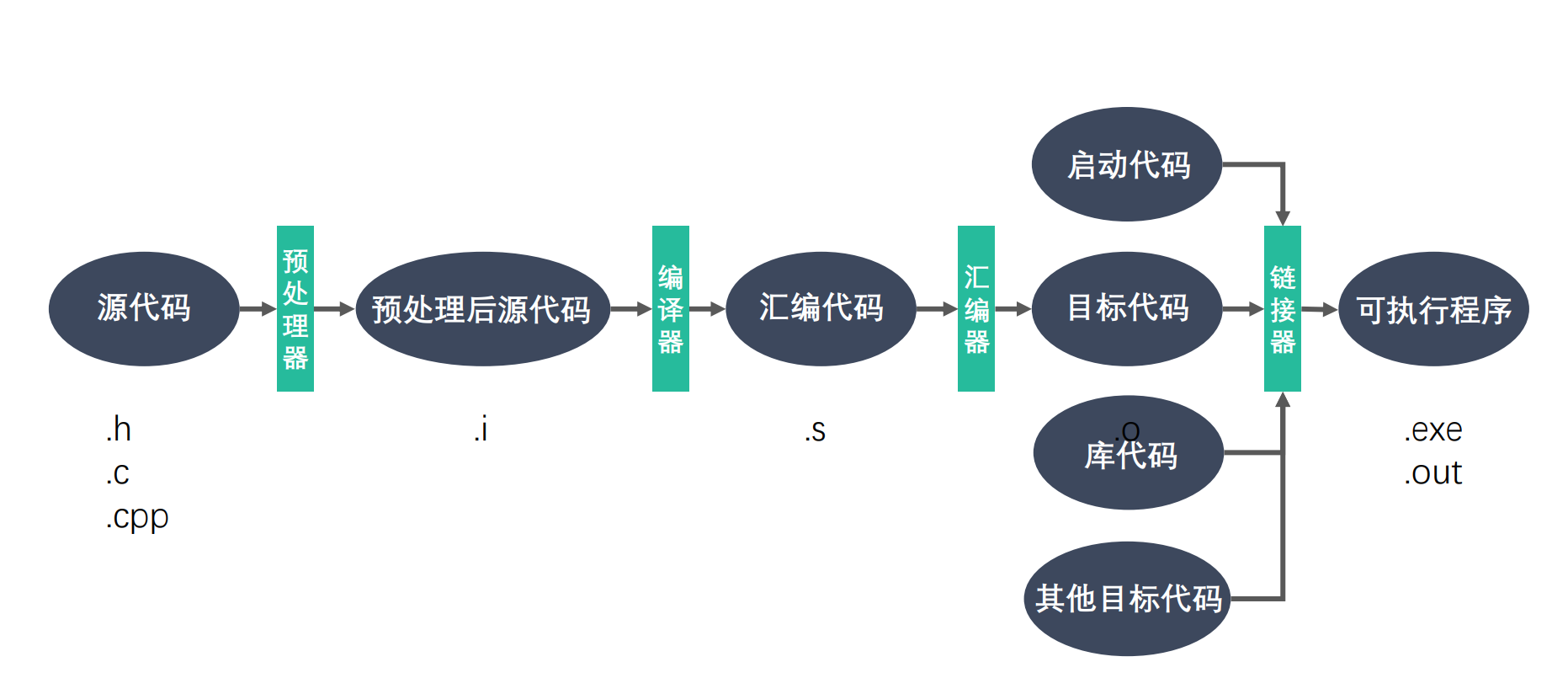 - 链接阶段得到最终的可执行程序 (可以直接 gcc xxx.c完成以上所有过程,也可以通过-o指定需要生成的名字)