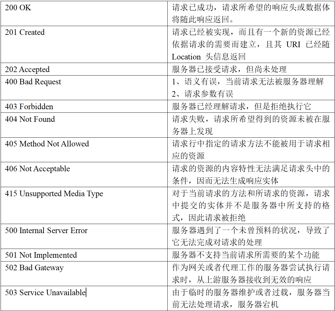 常用的:200 201 202 400 404 405 406 415 500 501 502 503