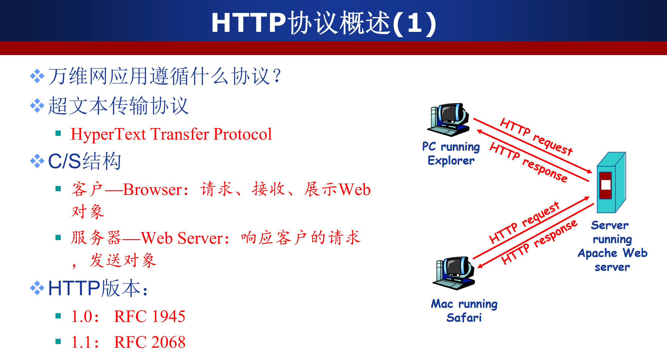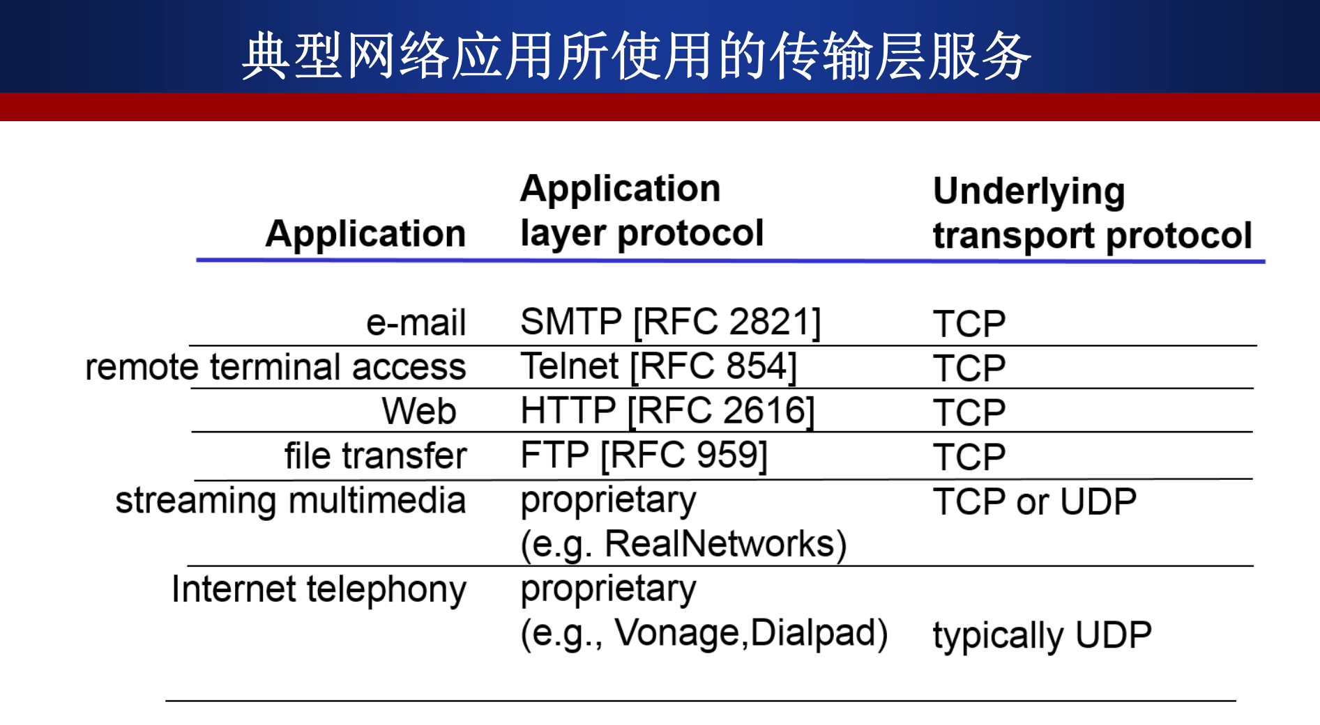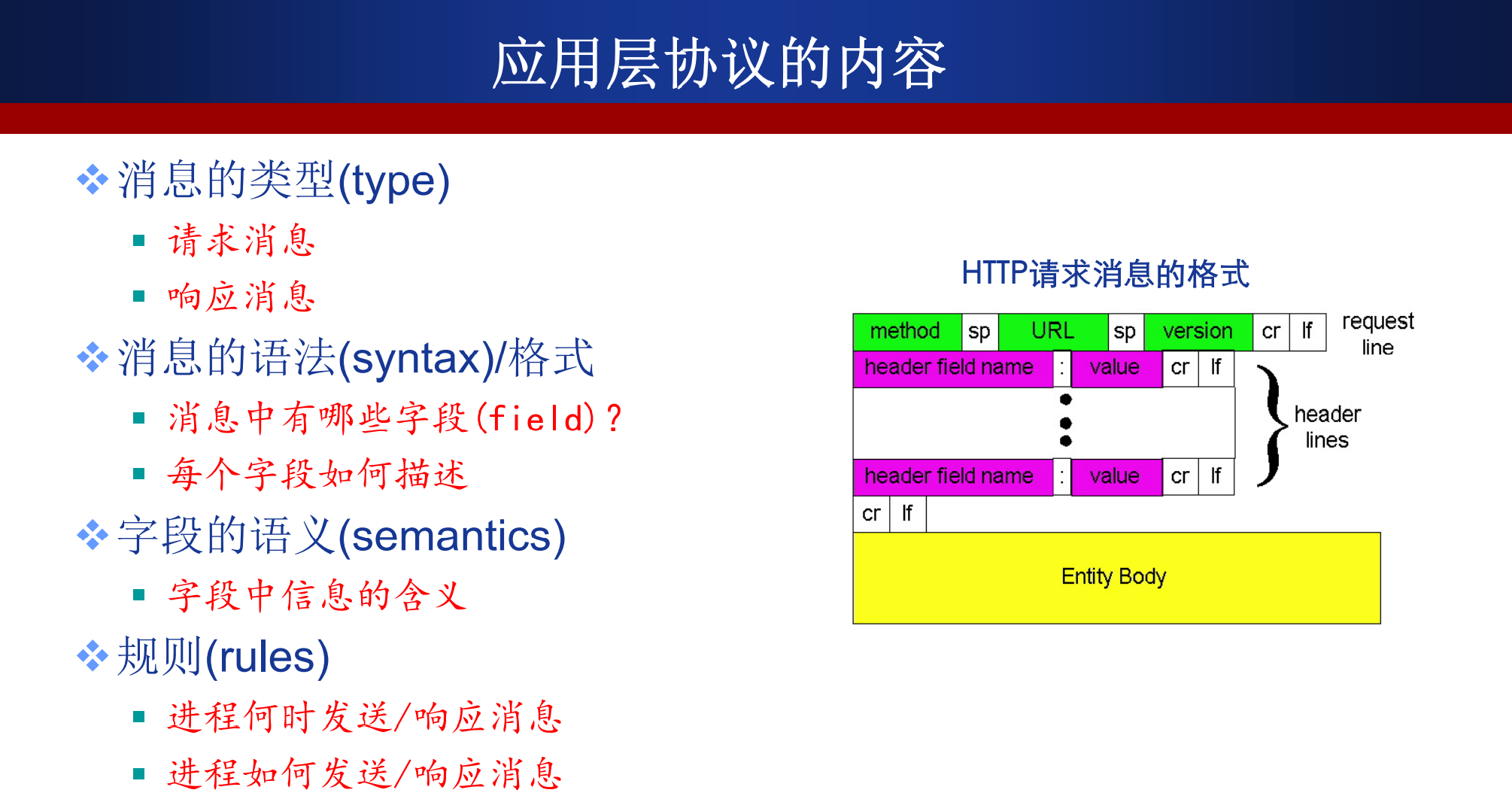 应用层协议 网络应用需遵循应用层协议 公开协议由RFC(Request For Comments)定义 允许互操作 HTTP, SMTP、 私有协议: 多数P2P文件共享应用
