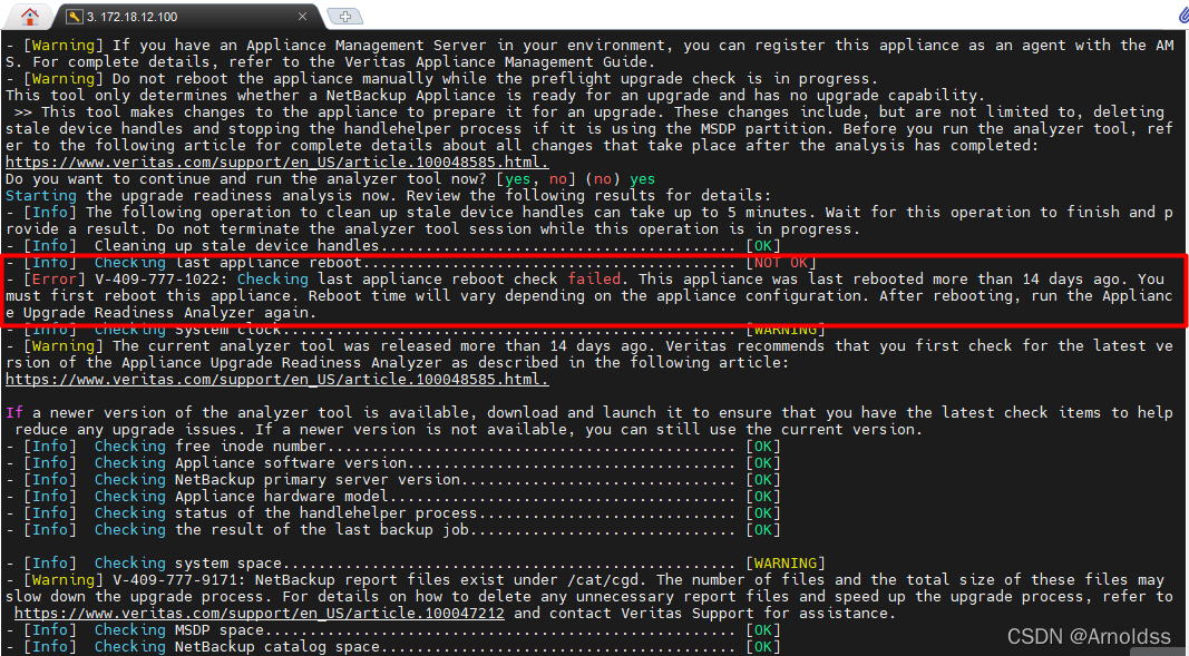 - [Error] V-409-777-1022: Checking last appliance reboot check failed. This appliance was last rebooted more than 14 days ago. You must first reboot this appliance. Reboot time will vary depending on the appliance configuration. After rebooting, run the Appliance Upgrade Readiness Analyzer again.