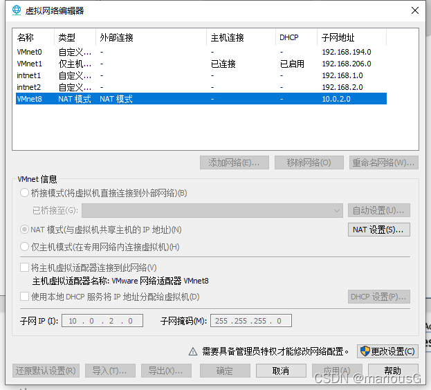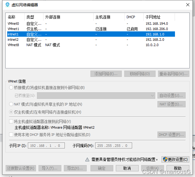 由图片可知。需要三个子网,分别是intnet1,intnet2,以及一个nat网络。注意,是否勾选 将主机虚拟适配器连接到此网络 和 使用本地DHCP服务将IP地址分配给虚拟机 全凭个人兴趣。warning:若nat网络勾选?将主机虚拟适配器连接到此网络 可能会导致无法上网