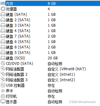 共4台虚拟机,其配置如下(主要是网络选择,如果要添加硬盘,请务必关机!!!):