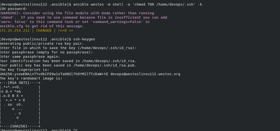 [devops@westoslinxu112 .ansible]$ ansible westos -m shell -a 'chmod 700 /home/devops/.ssh' -k SSH password: