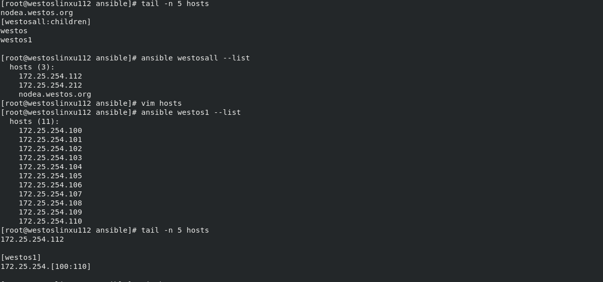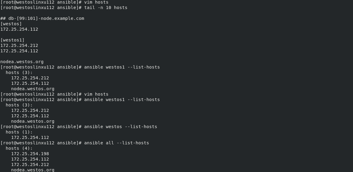 [root@westoslinxu112 ansible]# ansible all --list-hosts ? hosts (2): ??? 172.25.254.112 ??? 172.25.254.212 [root@westoslinxu112 ansible]# ansible westos --list-hosts ? hosts (1): ??? 172.25.254.112 [root@westoslinxu112 ansible]# ansible westos1 --list-hosts ? hosts (2): ??? 172.25.254.212 ??? 172.25.254.112