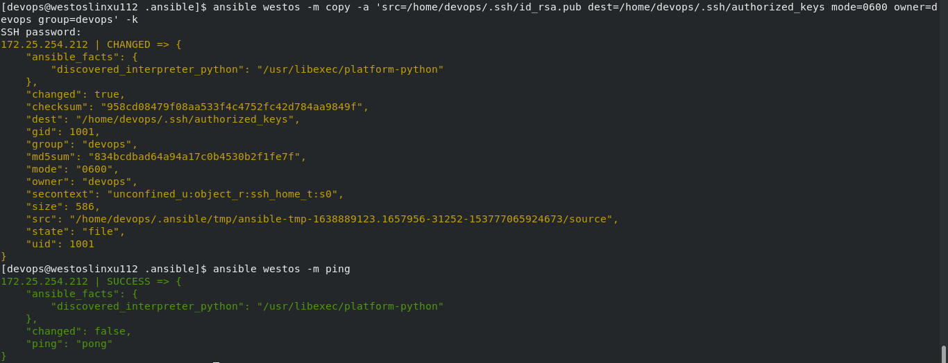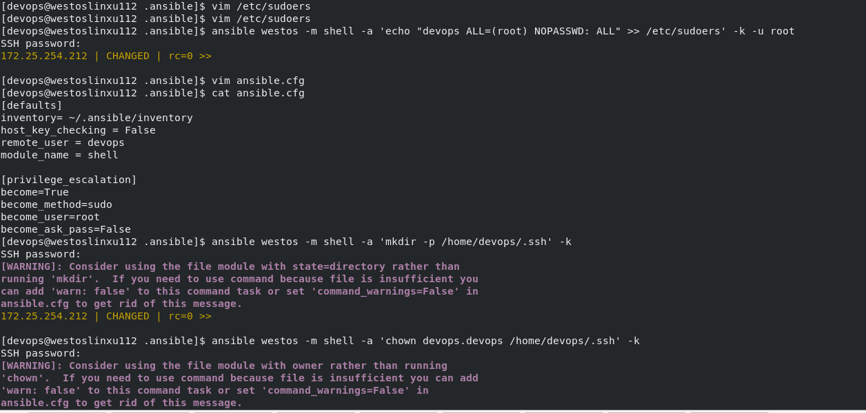 [devops@westoslinxu112 .ansible]$ ansible westos -m shell -a 'chown devops.devops /home/devops/.ssh' -k SSH password: