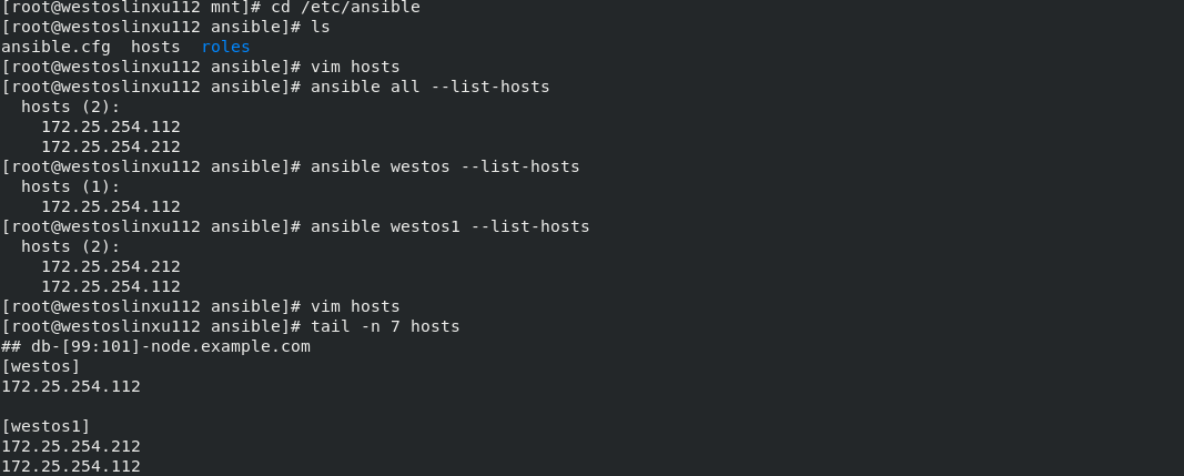 [root@westoslinxu112 mnt]# cd /etc/ansible [root@westoslinxu112 ansible]# ls ansible.cfg? hosts? roles [root@westoslinxu112 ansible]# vim hosts