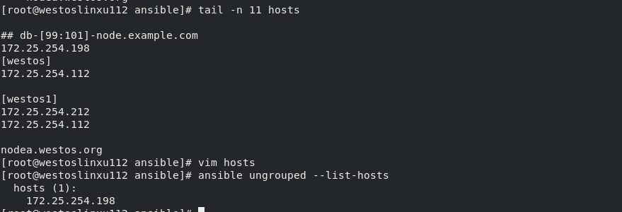[root@westoslinxu112 ansible]# ansible ungrouped --list-hosts ? hosts (1): ??? 172.25.254.198