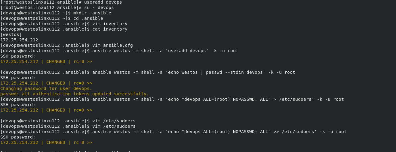 [devops@westoslinxu112 .ansible]$ ansible westos -m shell -a 'echo westos | passwd --stdin devops' -k -u root SSH password: 172.25.254.212 | CHANGED | rc=0 >> Changing password for user devops. passwd: all authentication tokens updated successfully. [devops@westoslinxu112 .ansible]$ ansible westos -m shell -a 'echo "devops ALL=(root) NOPASSWD: ALL" >>? /etc/sudoers' -k -u root SSH password: 172.25.254.212 | CHANGED | rc=0 >>