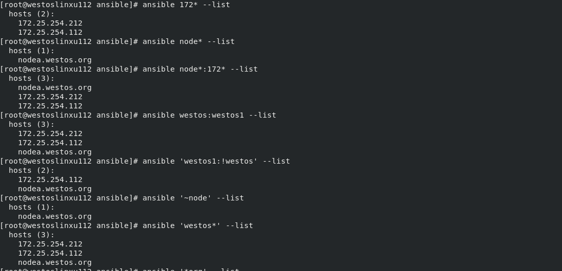 [root@westoslinxu112 ansible]# ansible 172* --list ? hosts (2): ??? 172.25.254.212 ??? 172.25.254.112 [root@westoslinxu112 ansible]# ansible node* --list ? hosts (1): ??? nodea.westos.org [root@westoslinxu112 ansible]# ansible node*:172* --list ? hosts (3): ??? nodea.westos.org ??? 172.25.254.212 ??? 172.25.254.112 [root@westoslinxu112 ansible]# ansible westos:westos1 --list ? hosts (3): ??? 172.25.254.212 ??? 172.25.254.112 ??? nodea.westos.org [root@westoslinxu112 ansible]# ansible 'westos1:!westos' --list ? hosts (2): ??? 172.25.254.112 ??? nodea.westos.org [root@westoslinxu112 ansible]# ansible '~node' --list ? hosts (1): ??? nodea.westos.org [root@westoslinxu112 ansible]# ansible 'westos*' --list ? hosts (3): ??? 172.25.254.212 ??? 172.25.254.112 ??? nodea.westos.org [root@westoslinxu112 ansible]# ansible '*org' --list ? hosts (1): ??? nodea.westos.org [root@westoslinxu112 ansible]# ansible '~(node|172)' --list ? hosts (3): ??? 172.25.254.212 ??? 172.25.254.112 ??? nodea.westos.org