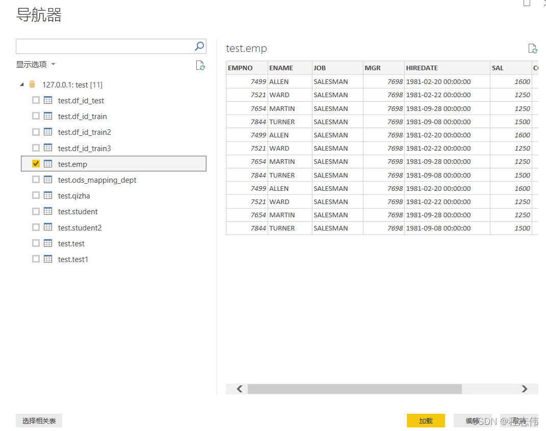 单击“确定”按钮后, 打开“导航器”对话框, 在左窗格中选中一个表后, 在右窗格中会出现该数据表的数据预览