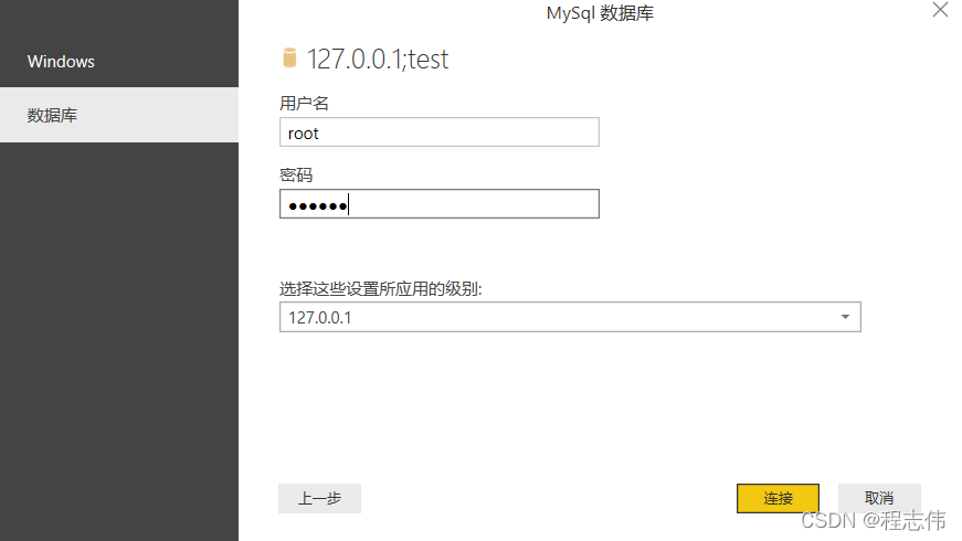 在打开的对话框的左侧选择“Windows”, 可以看到“使用您的 Windows凭据访问此数据库”设置界面