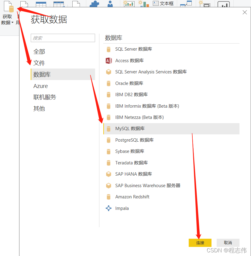 打开“获取数据”对话框, 选择“数据库”类型中的“MySQL 数据库”