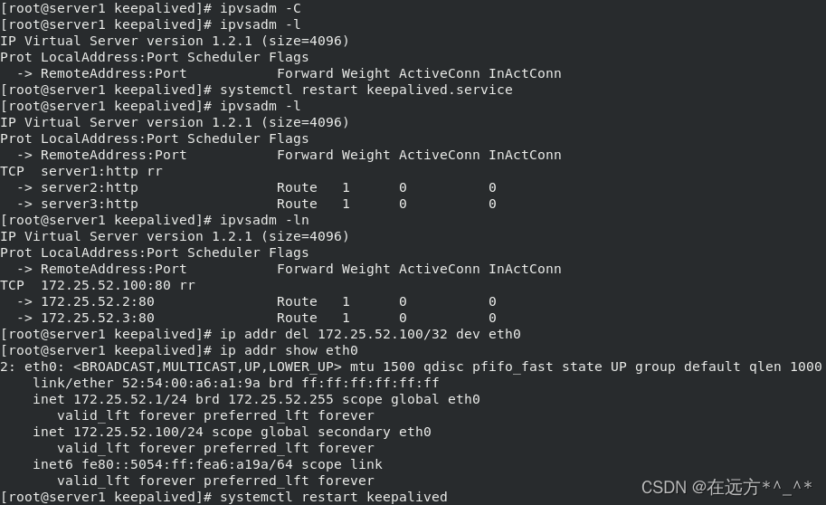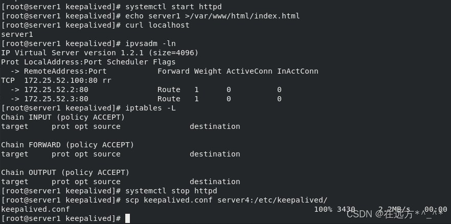 删掉server1上手动设置的虚拟ip172.25.52.100 ipvsadm -C清除设置的规则, 启动keepalived软件(在配置文件中已设置,需将手动添加的ip删除)