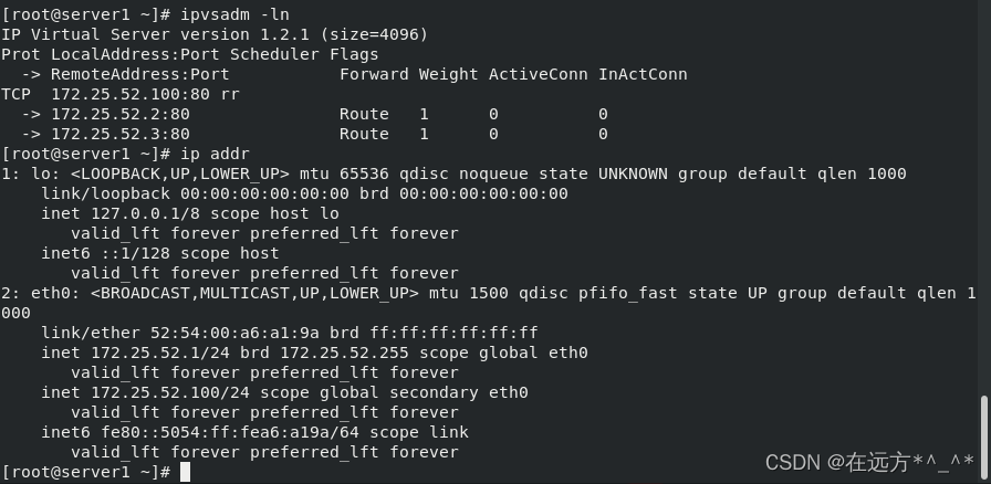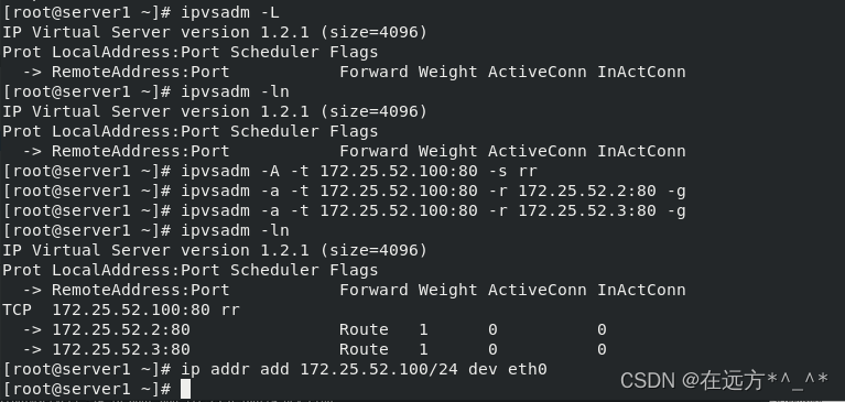 [root@server1 ~]# ipvsadm -a -t 172.25.52.100:80 -r 172.25.52.2:80 -g