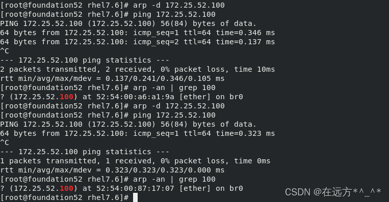 此时使用arp -an查看本地ARP缓存的172.25.52.100对应的MAC地址为调度器server1的地址,当真机执行arp -d 删除指定虚拟IP的ARP缓存后,此时不能过滤得到172.25.52.100的MAC地址。再次ping之后又可以得到(是server2的地址),但不是调度器的地址(谁先响应就缓存谁的MAC地址)