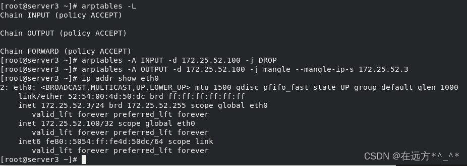 [root@server3 ~]# arptables -A OUTPUT -d 172.25.52.100 -j mangle --mangle-ip-s 172.25.52.3