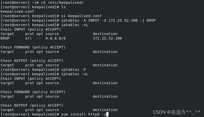 [root@server1 keepalived]# iptables -A INPUT -d 172.25.52.100 -j DROP