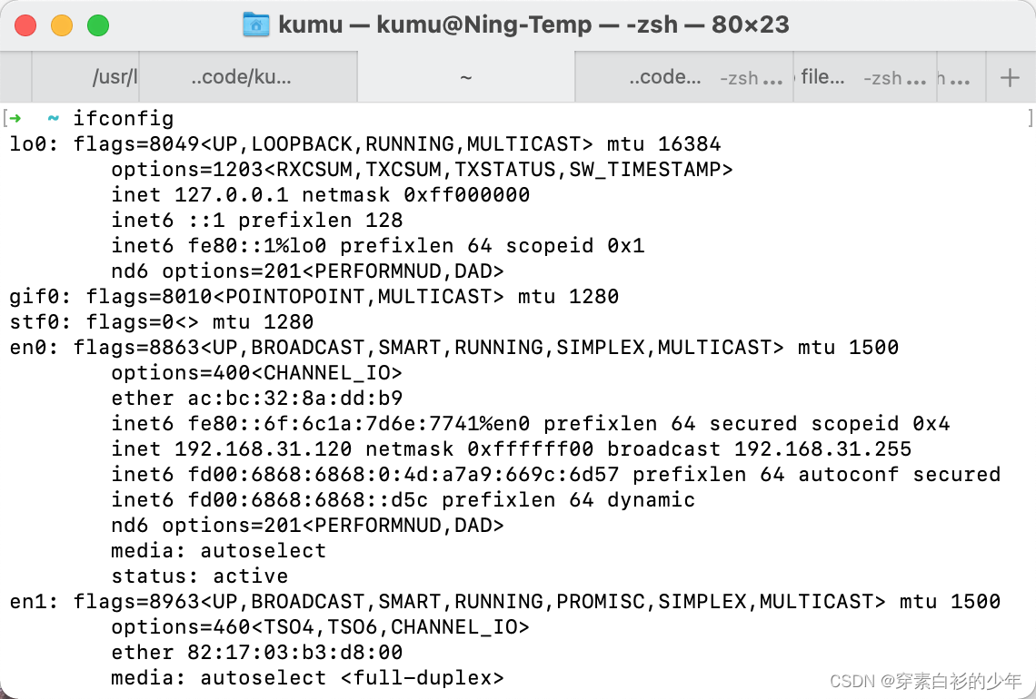 本地环回接口不需要,所以为空。 MAC 地址是一个网卡的物理地址,具体概念我们在链路层已经详细介绍过,使用十六进制表示,用冒号分隔,总共是六个字节。MAC 地址只能再同一个网段内通信,跨网段通信需要借助 IP 地址,所以接下来就是网卡的 IP 地址。 IPv4 地址 首先是 IPv4 地址: