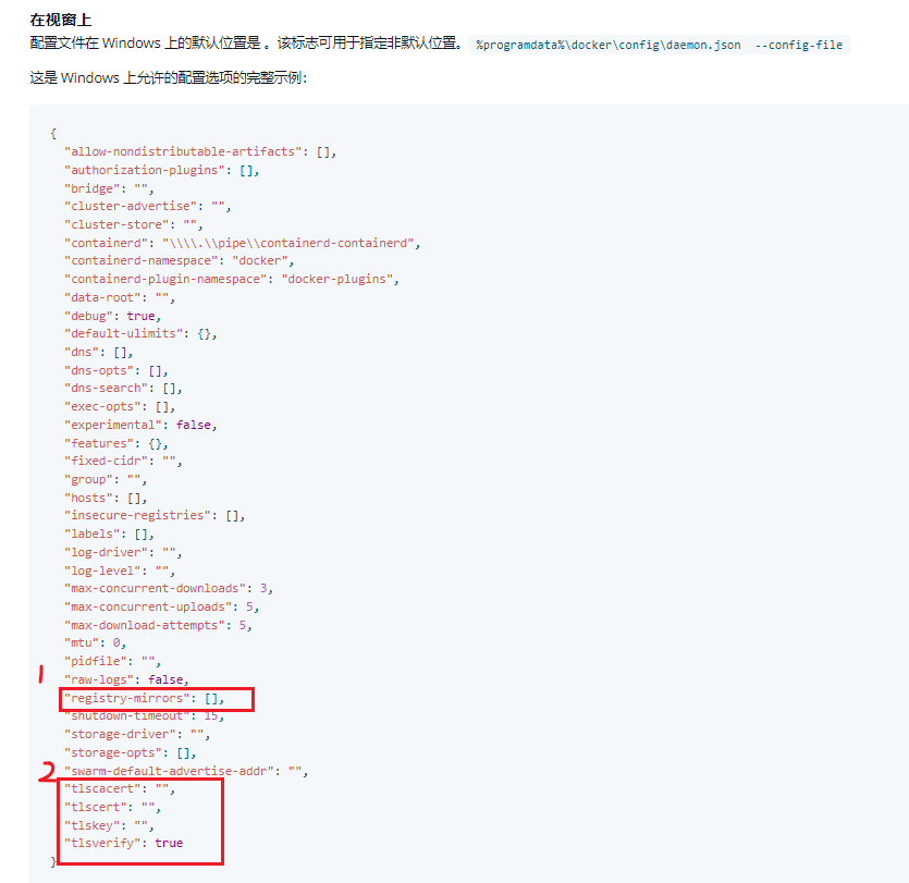 ?"registry-mirrors": [ ? ? "https://docker.mirrors.ustc.edu.cn", ? ? "https://registry.docker-cn.com", ? ? "https://hub-mirror.c.163.com", ? ? "https://mirror.ccs.tencentyun.com", ? ? "http://f1361db2.m.daocloud.io" ? ], ? "tlscacert":"(ca.pem)", ? "tlscert": "(server-cert.pem)", ? "tlskey": "(server-key.pem)", ? "tlsverify": true