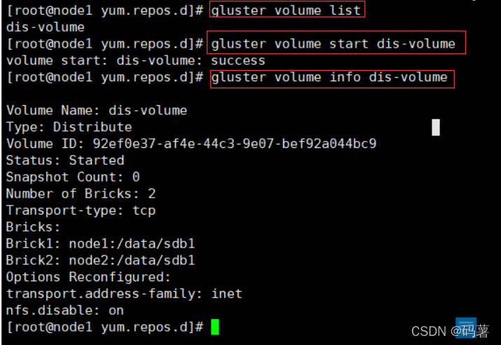 gluster volume create dis-volume node1:/data/sdb1 node2:/data/sdb1 force