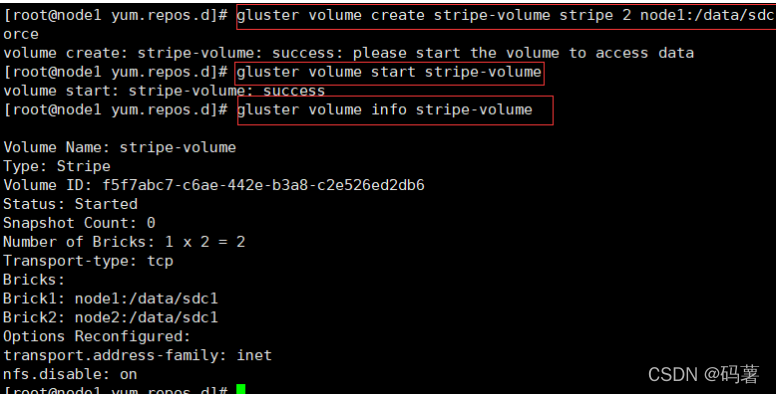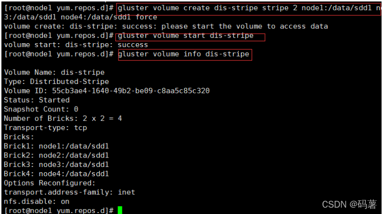 gluster volume create dis-stripe stripe 2 node1:/data/sdd1 node2:/data/sdd1 node3:/data/sdd1 node4:/data/sdd1 force