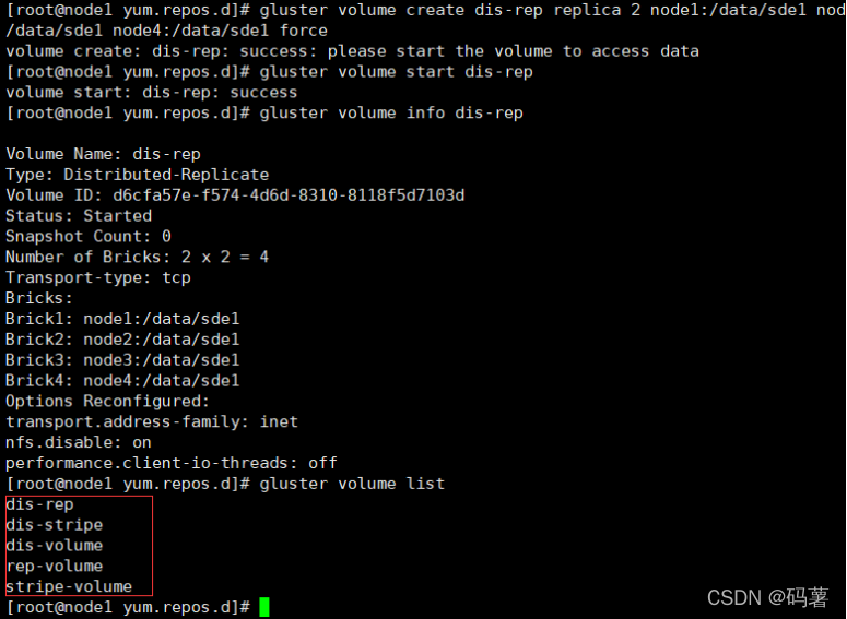 gluster volume create dis-rep replica 2 node1:/data/sde1 node2:/data/sde1 node3:/data/sde1 node4:/data/sde1 force