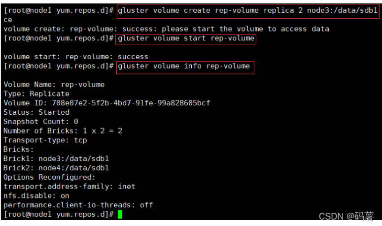 gluster volume create rep-volume replica 2 node3:/data/sdb1 node4:/data/sdb1 force