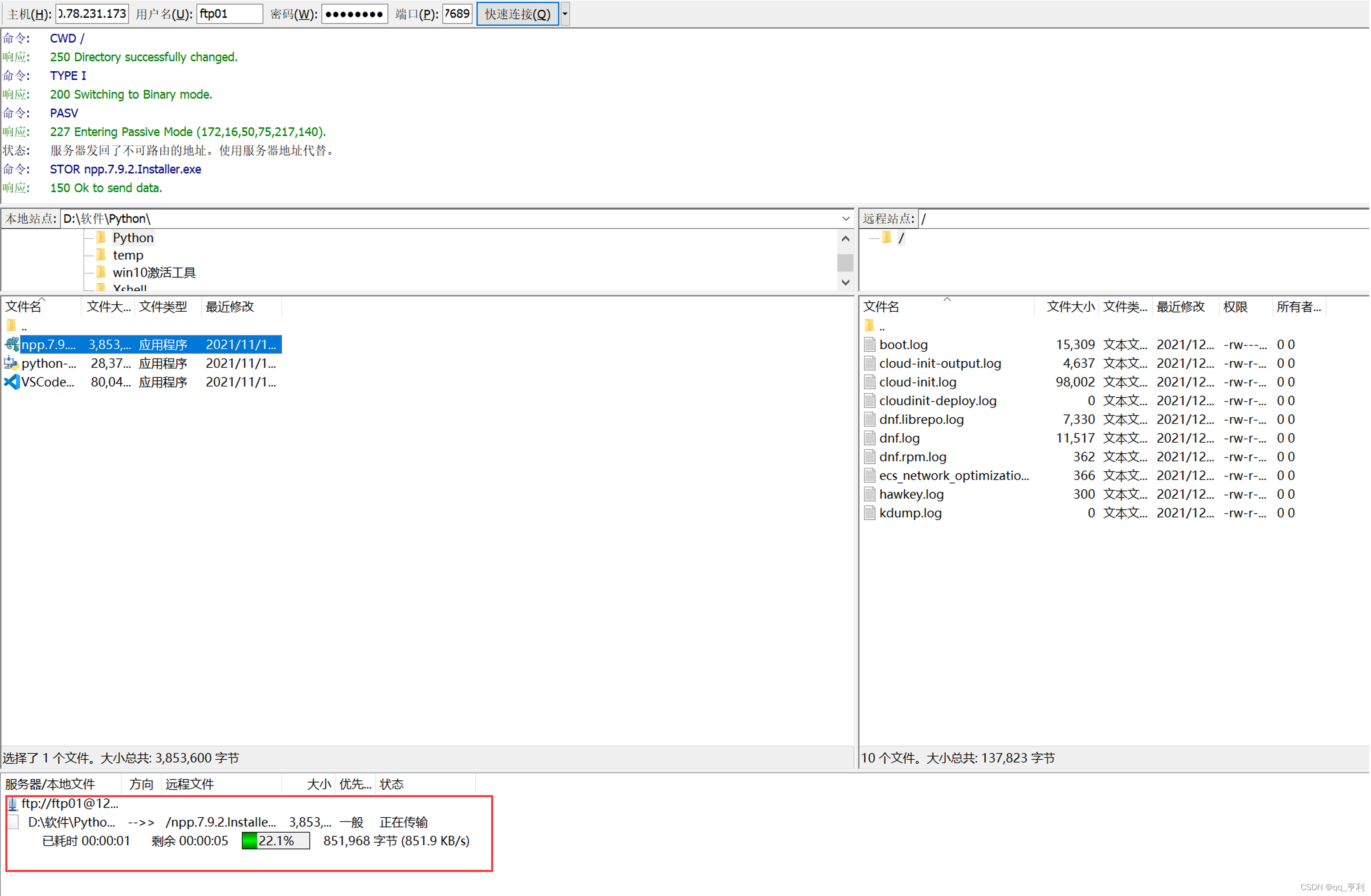????????1.用filezilla登录ftp服务器,能正常登录并打开ftp用户的家目录