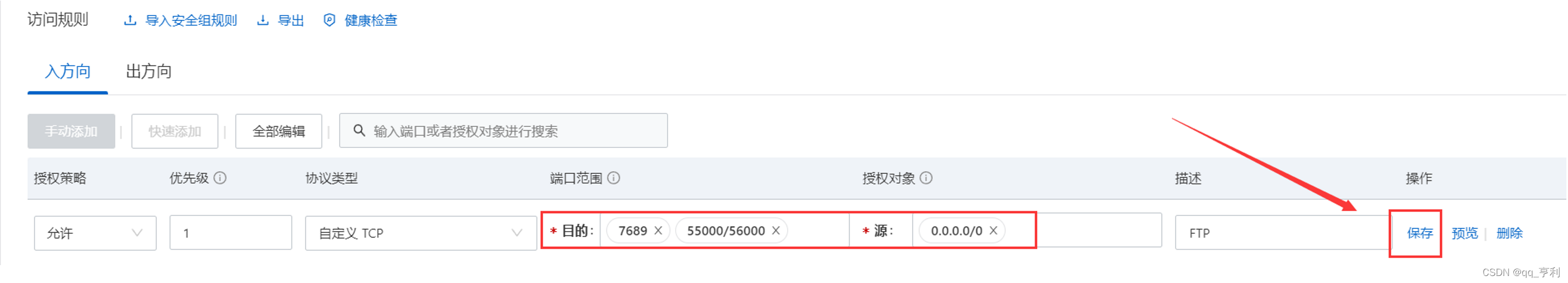 服务器所在的安全组规则的“入方向”添加端口信息,vsftpd监听的端口(7689)和数据传输所用的端口(55000-56000)