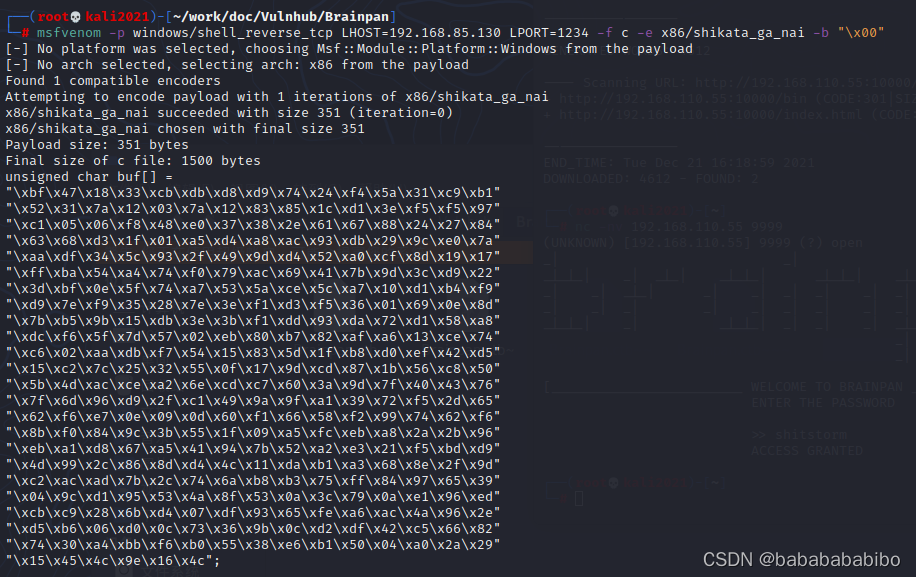 这里拿msf生成一下反弹shell的shellcode 把他放到原先payload的位置 再给我们的shellcode加个nops slide 最终代码就生成啦(只不过用在靶机上的时候 shellcode需要重新生成 连接的ip和端口也需要更改一下)