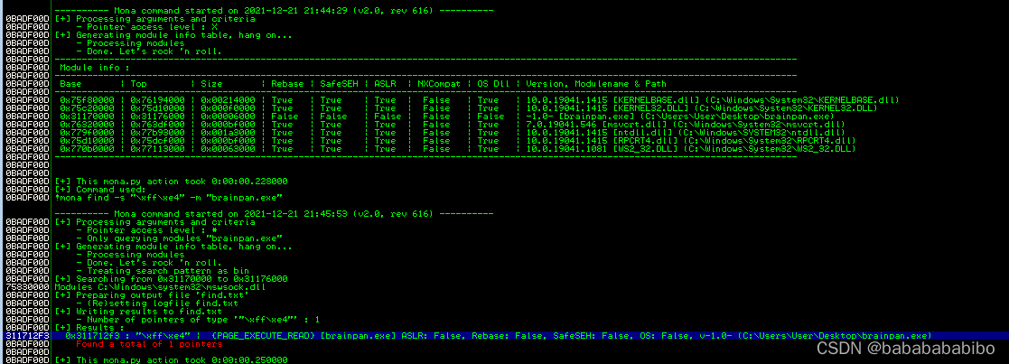然后就是找到可以跳转到ESP寄存器的地址用来来替换eip变量?这里用mona.py来在brainpan.exe里面查找(这里\xff\xe4即JMP ESP汇编指令的十六进制表示)