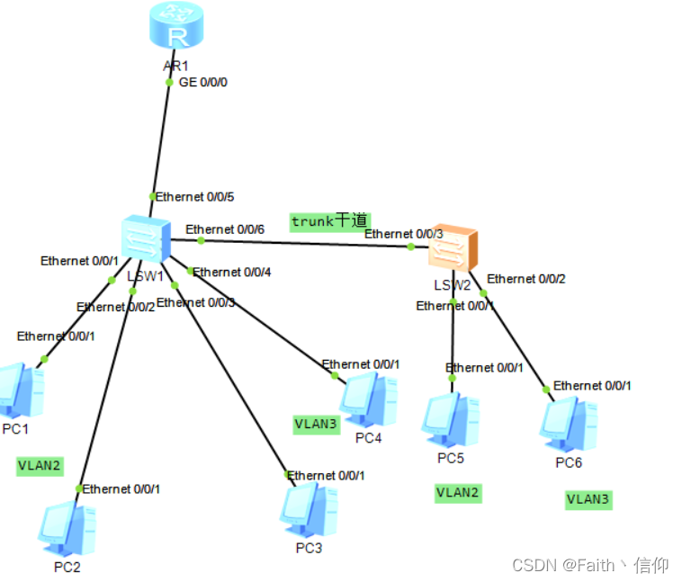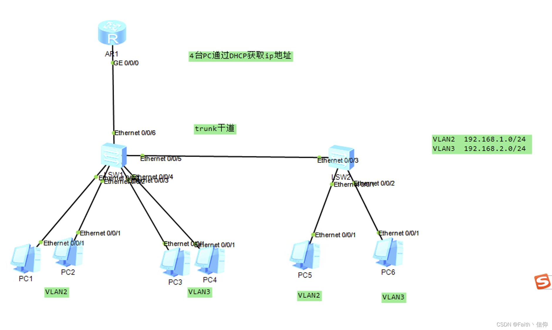 [sw1-Ethernet0/0/5]port trunk allow-pass vlan 2 to 3