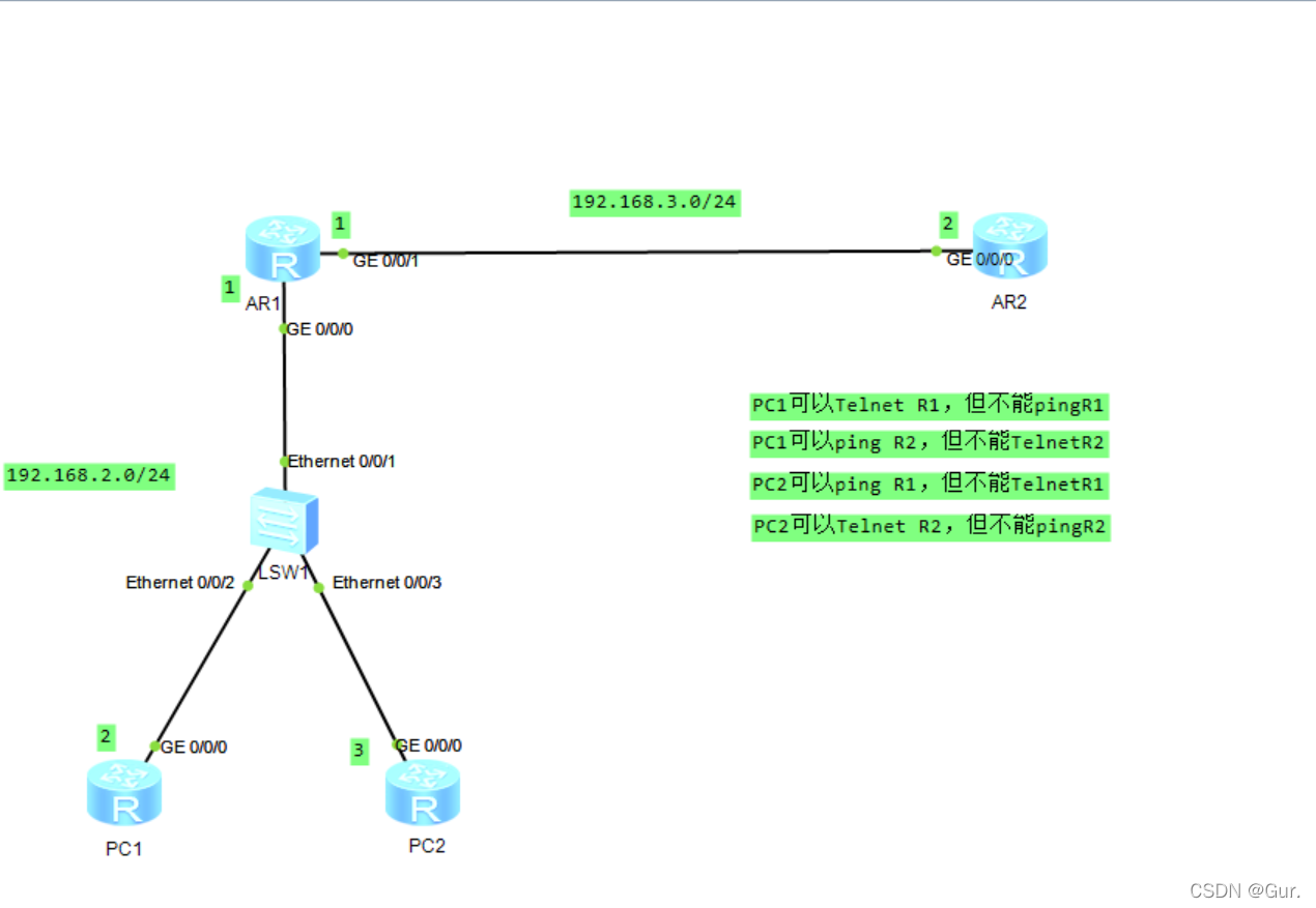 ? 但此时题目要求是PC1可以Telnet R1,但不能pingR1,PC1可以ping R2,但不能TelnetR2?,PC2可以ping R1,但不能TelnetR1,PC2可以Telnet R2,但不能pingR2