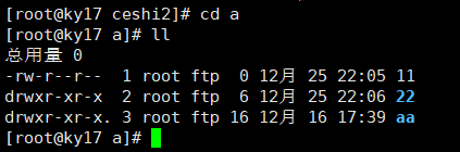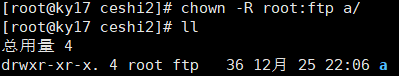 进入a目录查看,目录下的子目录和文件属主属组都变为root,ftp