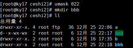 umask设置∶ umask 022?(022是反掩码,777为最大权限,可以理解 777-022=755,所以创建bbb的目录权限是755